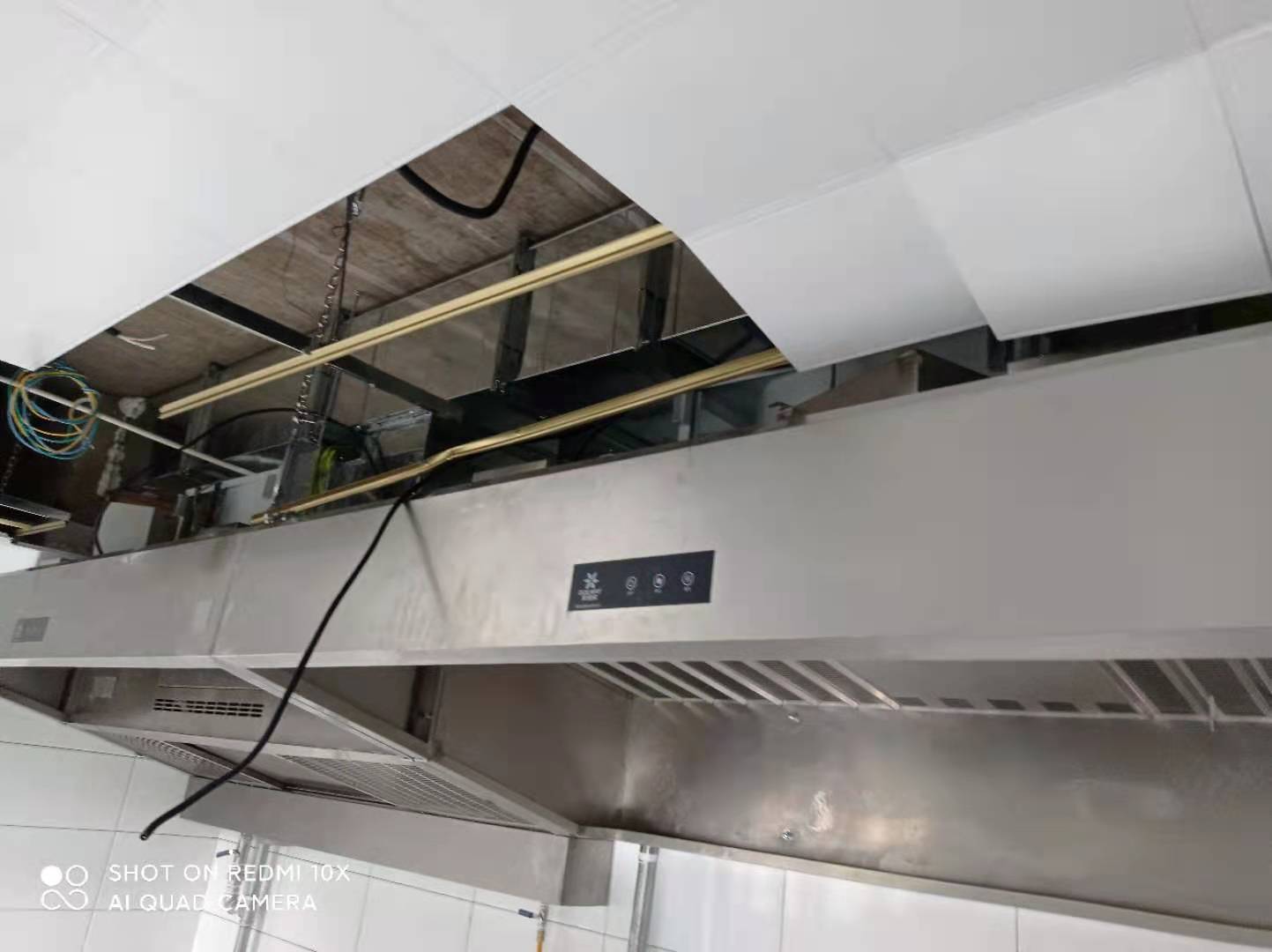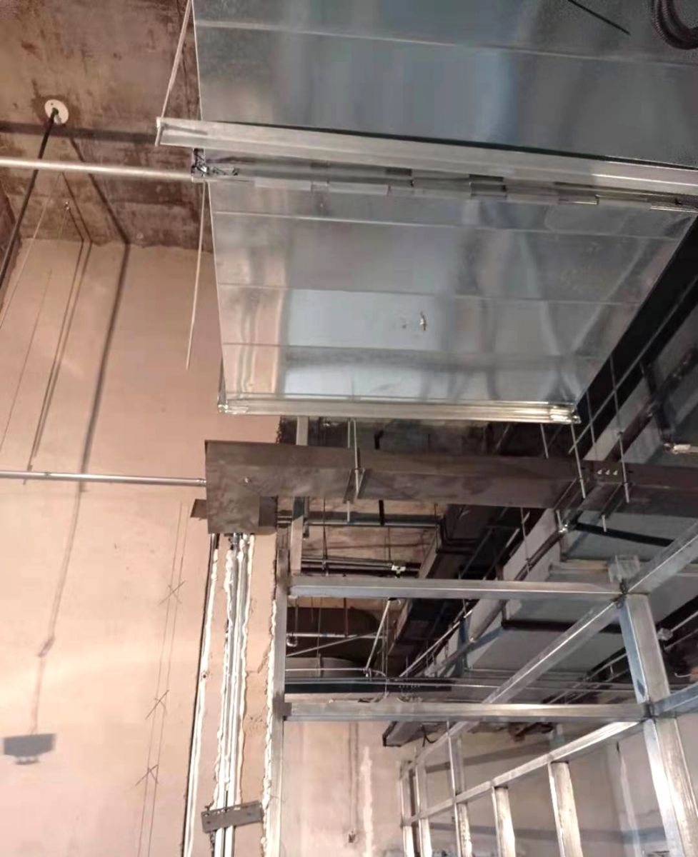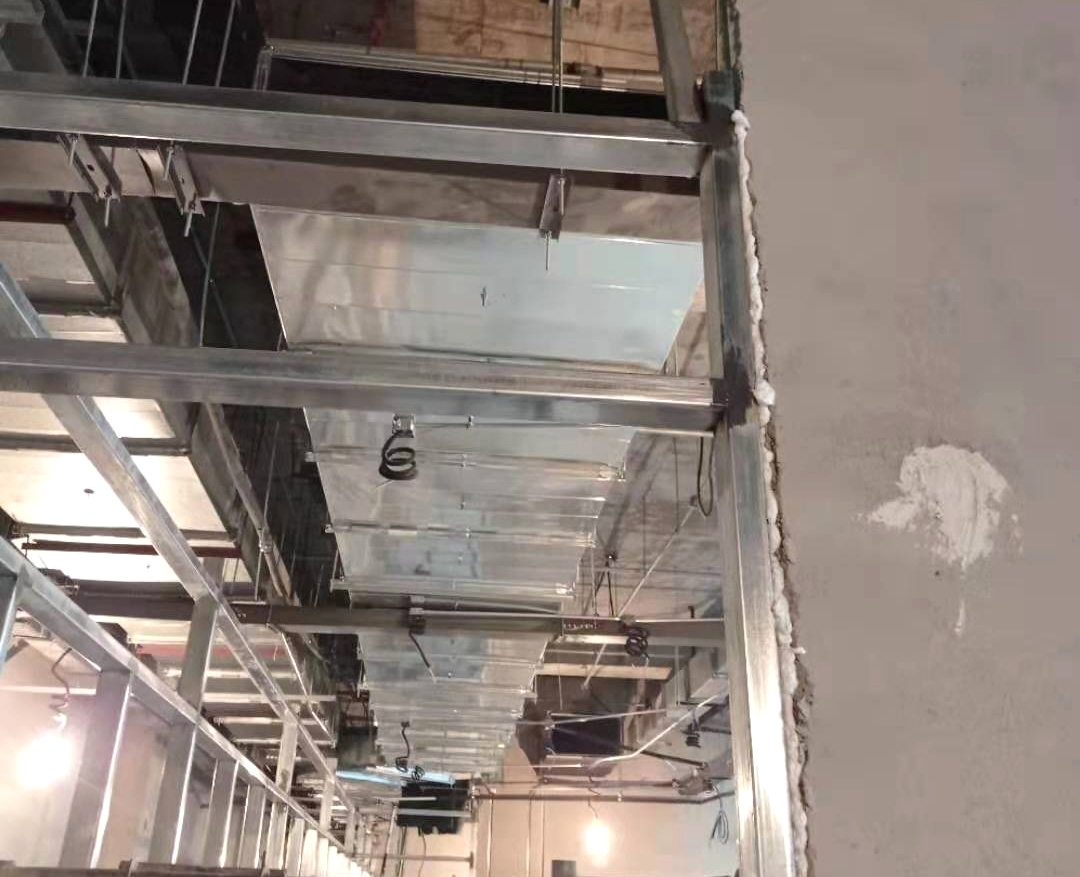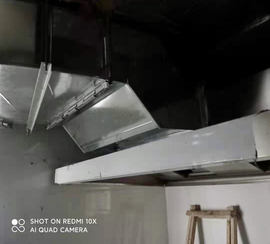 副食間、主食間煙罩風管對接完成,五樓明檔煙罩吊完