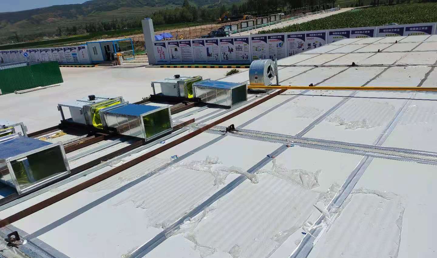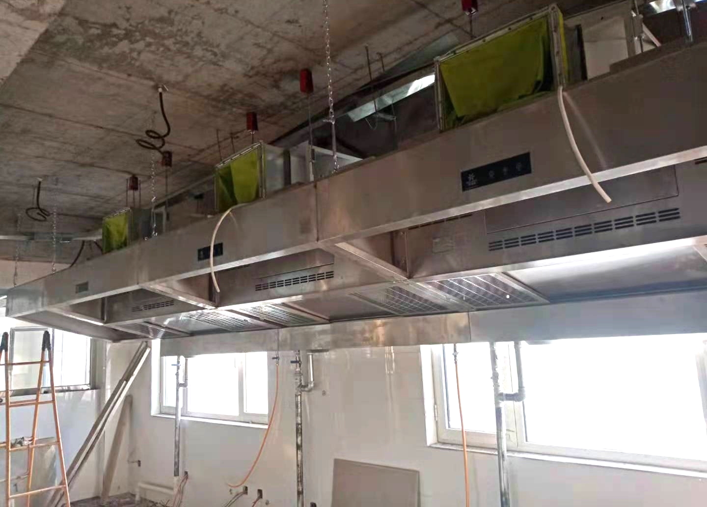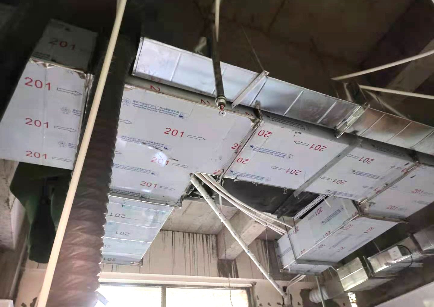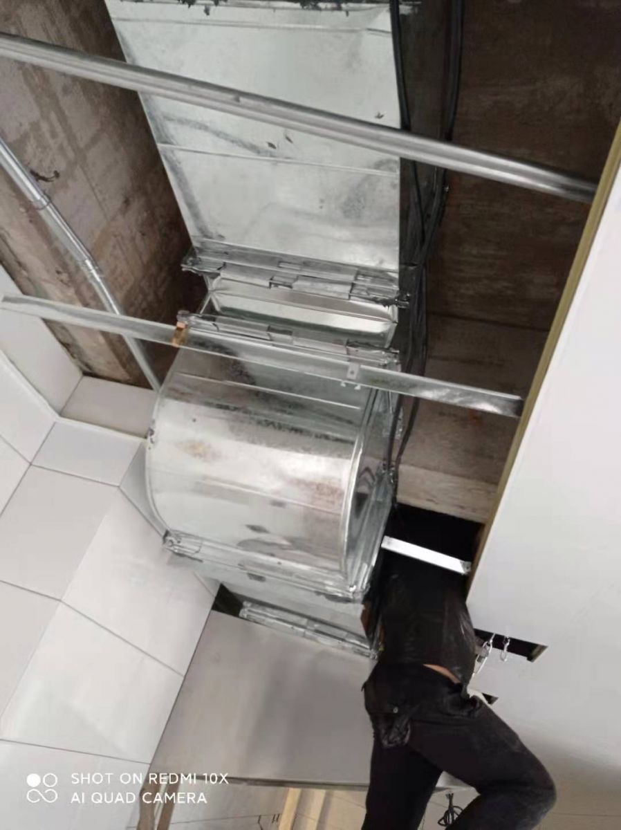 副食間、主食間煙罩風管對接完成,五樓明檔煙罩吊完