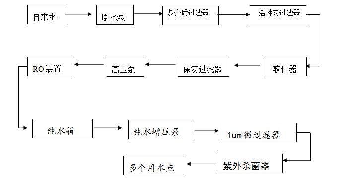 根據進水水質及行業對系統產水指標的要求,從系統出力、產品質量、技術先進性、項目投資、運行成本、安全性和環保效益等方面考慮,依照提高系統性能價格比的原則,我們設計了工作流程如下: